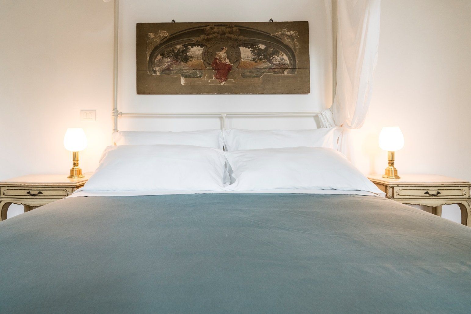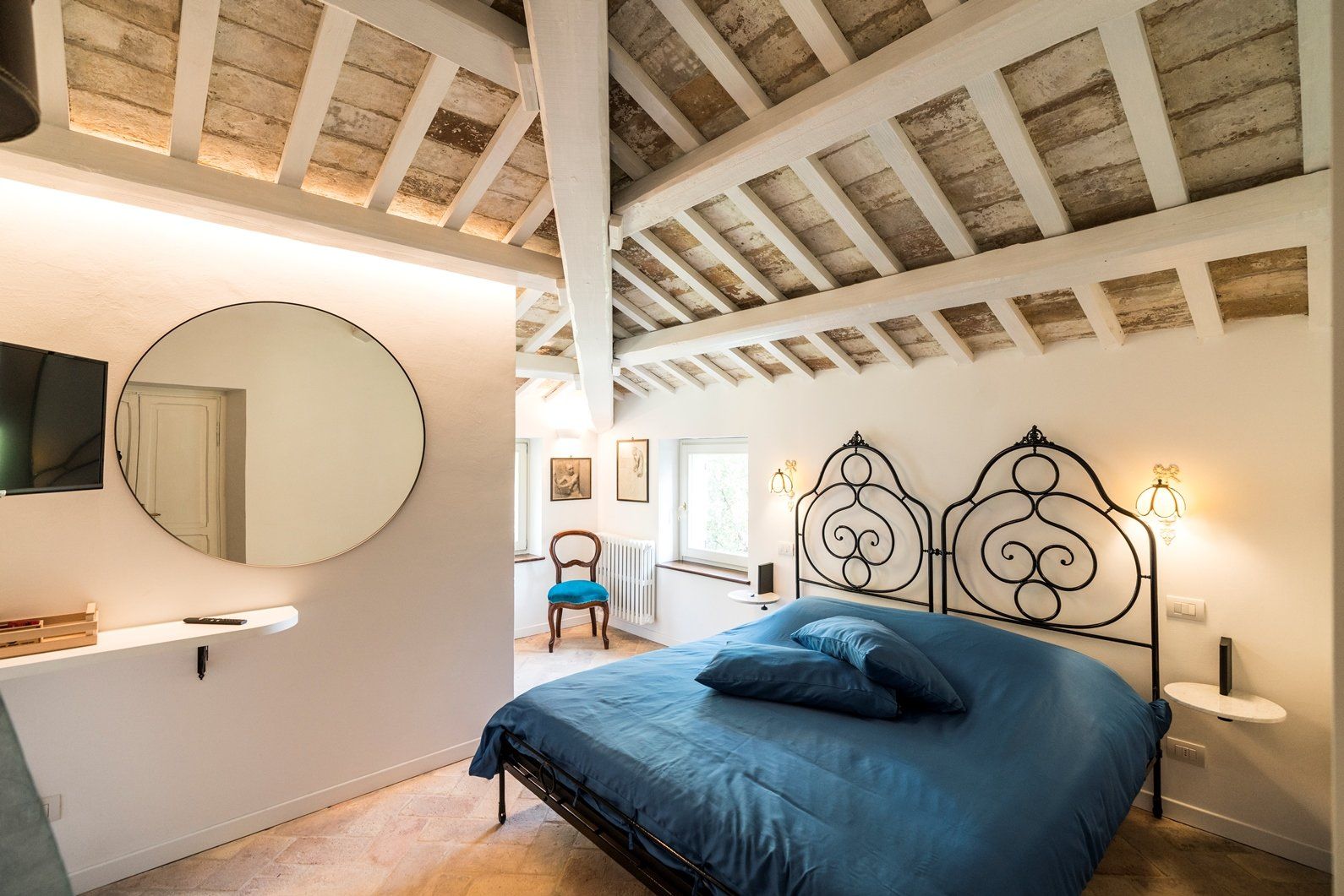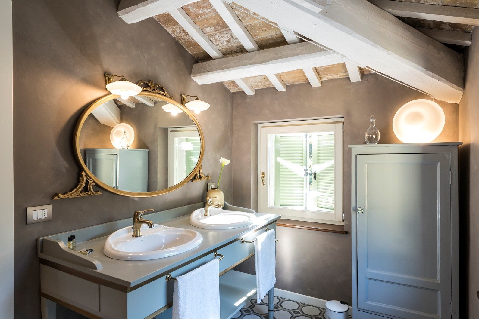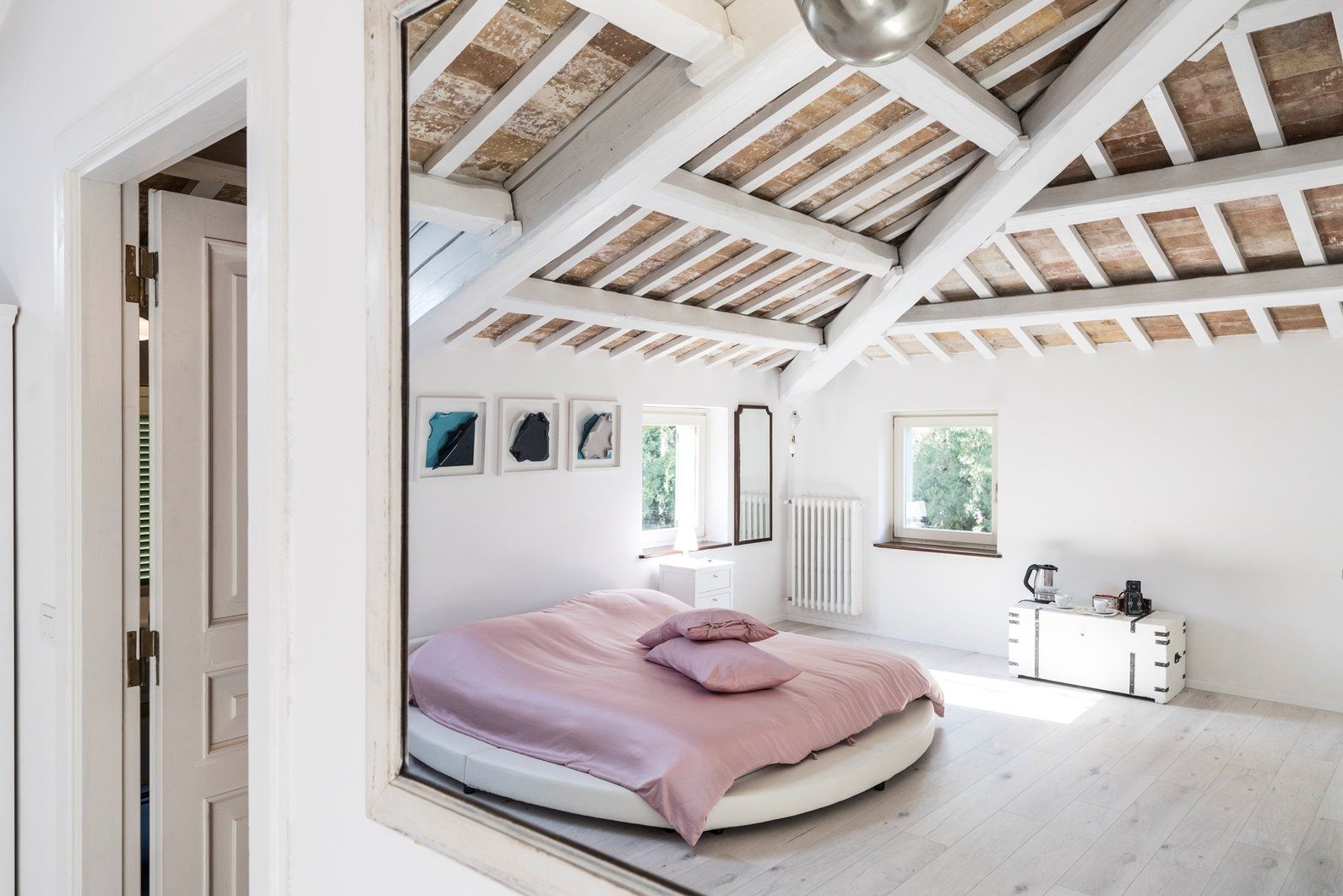 che prende il nome dall'artista contemporaneo i cui lavori si possono ammirare al di sopra del bellissimo letto tondo che spicca al centro della stanza. Un ambiente ampio, caratterizzato da un soffittatura di travi bianche e illuminato da due finestre che si affacciano sul giardino della villa, e da un imponente lucernario sul soffitto che di notte vi permetterà di ammirare le stelle. Anche nel bagno sui toni del grigio, il recupero è stato il leit motiv nella scelta degli arredi: lampade di raffinata ceramica grigia appartenute a una vita passata, doppi lavandini incassati in un vecchio tavolo da stiro trasformato in un originale mobile da toletta, un grande specchio antico fa da cornice.