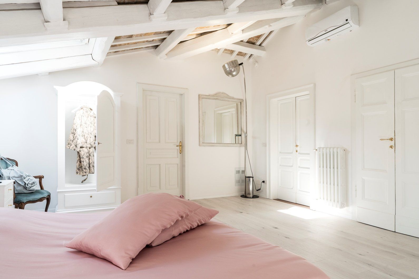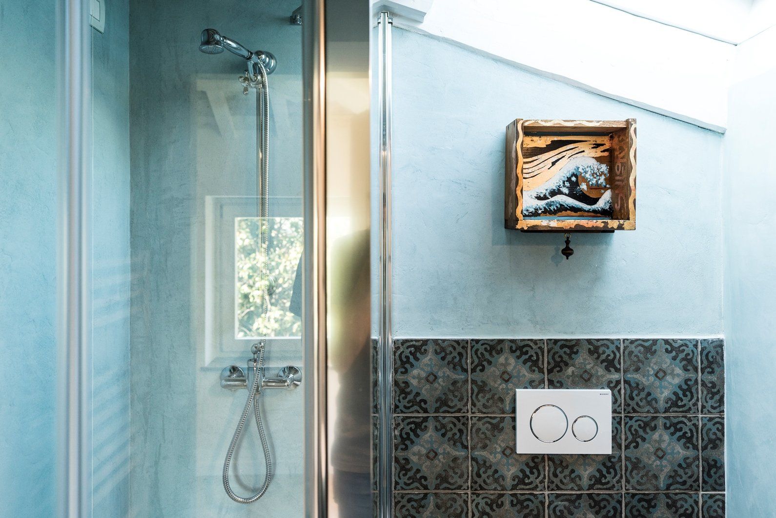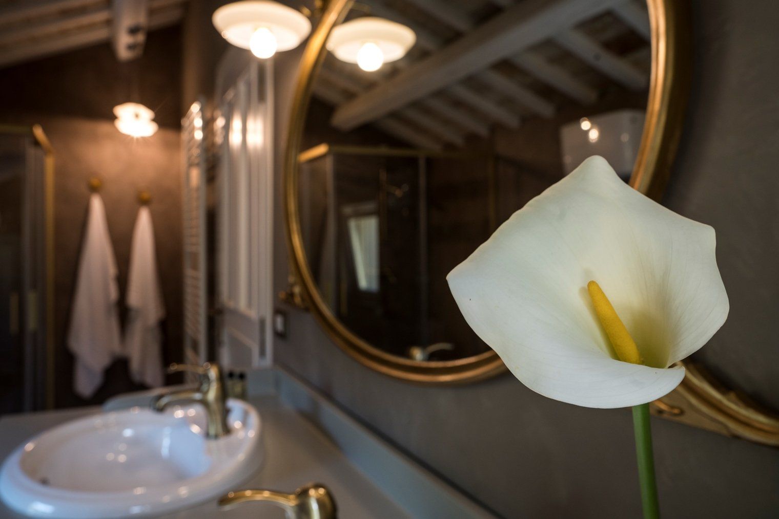 che prende il nome dall'artista contemporaneo i cui lavori si possono ammirare al di sopra del bellissimo letto tondo che spicca al centro della stanza. Un ambiente ampio, caratterizzato da un soffittatura di travi bianche e illuminato da due finestre che si affacciano sul giardino della villa, e da un imponente lucernario sul soffitto che di notte vi permetterà di ammirare le stelle. Anche nel bagno sui toni del grigio, il recupero è stato il leit motiv nella scelta degli arredi: lampade di raffinata ceramica grigia appartenute a una vita passata, doppi lavandini incassati in un vecchio tavolo da stiro trasformato in un originale mobile da toletta, un grande specchio antico fa da cornice.