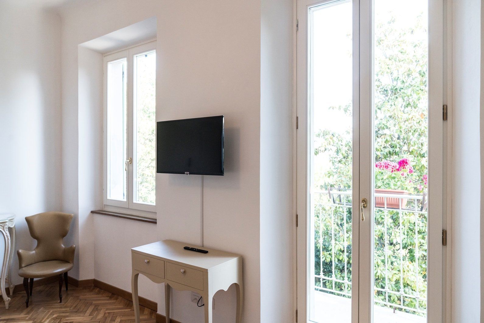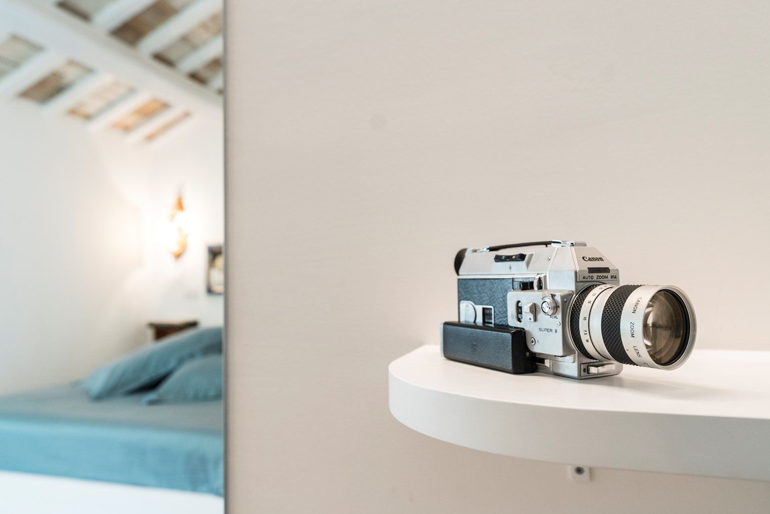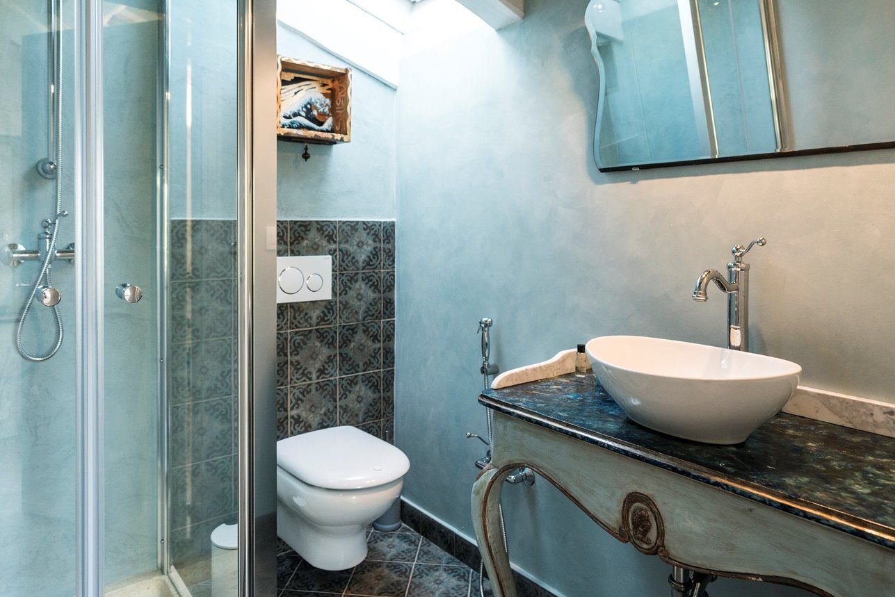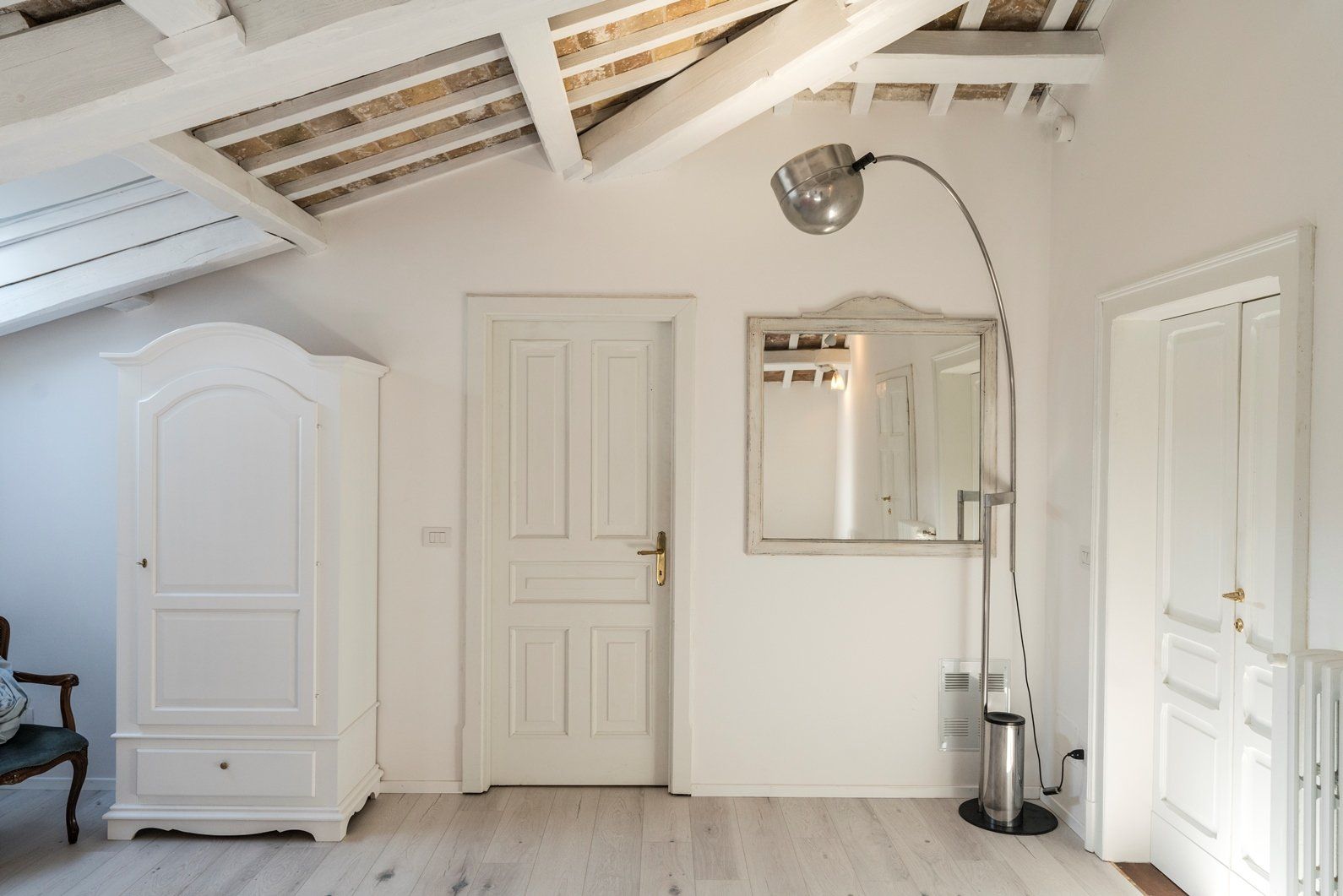 che prende il nome dall'artista contemporaneo i cui lavori si possono ammirare al di sopra del bellissimo letto tondo che spicca al centro della stanza. Un ambiente ampio, caratterizzato da un soffittatura di travi bianche e illuminato da due finestre che si affacciano sul giardino della villa, e da un imponente lucernario sul soffitto che di notte vi permetterà di ammirare le stelle. Anche nel bagno sui toni del grigio, il recupero è stato il leit motiv nella scelta degli arredi: lampade di raffinata ceramica grigia appartenute a una vita passata, doppi lavandini incassati in un vecchio tavolo da stiro trasformato in un originale mobile da toletta, un grande specchio antico fa da cornice.