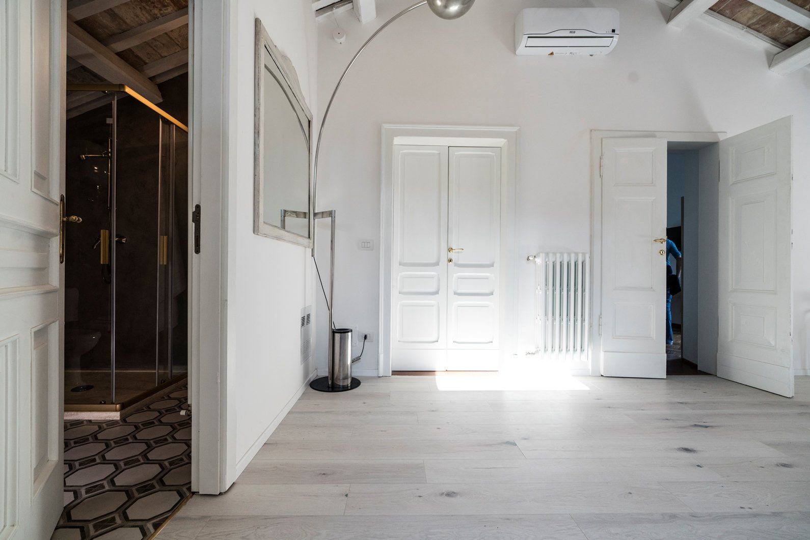 The second room of the suite is the Ivanco room, which takes its name from the contemporary artist whose works can be admired above the beautiful round bed that stands out in the center of the room. A large room, characterized by a ceiling of white beams and illuminated by two windows that overlook the garden of the villa, and by an imposing vasistas on the ceiling that at night will allow you to admire the stars. Even in the bathroom in shades of gray, recovery was the leitmotif in the choice of furnishings: refined gray ceramic lamps from a past life, double sinks built into an old ironing table transformed into an original dressing table, a large antique mirror is the frame.